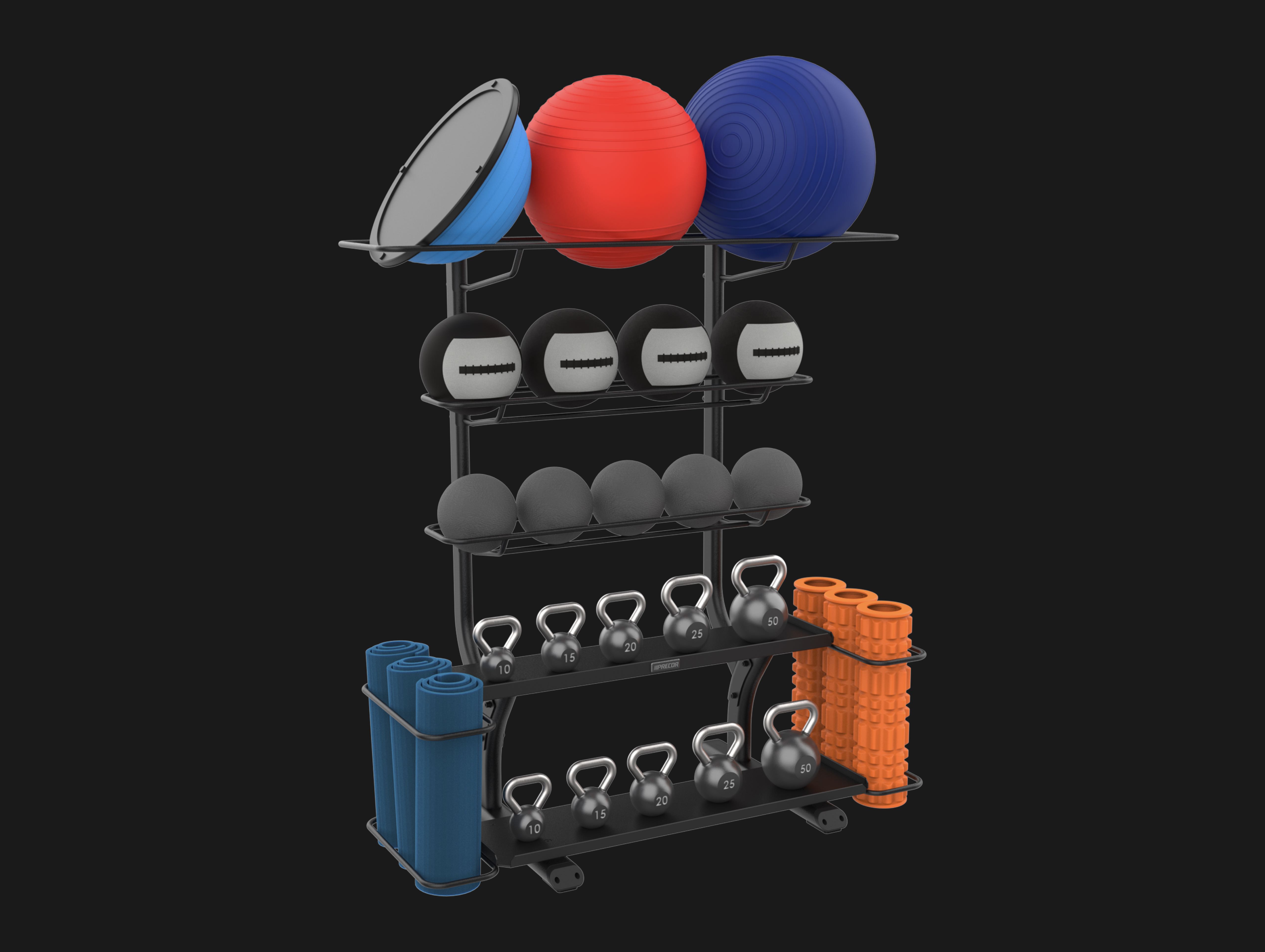 From the top down, this space-efficient Accessories Storage Rack can hold one large yoga ball, one small yoga ball, one Bosu ball, up to four medicine balls or 8 slam balls, 14 kettle bells, and up to 4 foam rollers or rolled mats.
