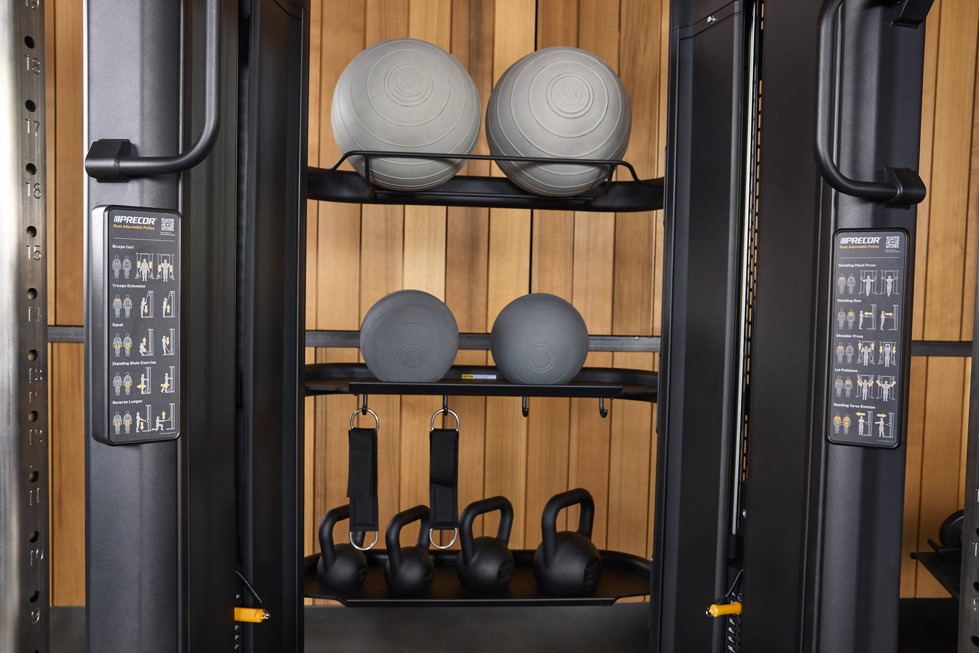Shelves and hooks cleanup and expand your functional training area.